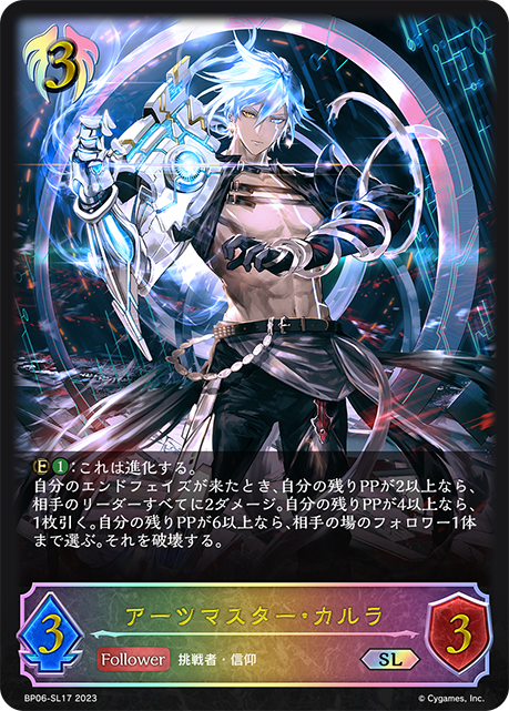 アーツマスター・カルラ クラス ビショップ カード種類 フォロワー・エボルヴ タイプ 挑戦者・信仰 レアリティ SL 収録商品 ブースターパック第6弾「絶対なる覇者」 コスト-攻撃力4体力4 自分のエンドフェイズが来たとき、自分のPPを2回復する。その後、自分の残りPPが2以上なら、相手のリーダーすべてに2ダメージ。自分の残りPPが4以上なら、1枚引く。自分の残りPPが6以上なら、相手の場のフォロワー1体まで選ぶ。それを破壊する。 ShuLaBP06-SL18