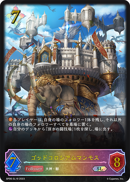 ゴッドコロシアムマンモス クラス ニュートラル カード種類 フォロワー タイプ 大神・獣 レアリティ SL 収録商品 ブースターパック第6弾「絶対なる覇者」 コスト7攻撃力7体力8 各プレイヤーは、自身の場のフォロワー1体を残し、それ以外の自身の場のフォロワーすべてを墓場に置く。自分のデッキから『頂きの闘技場』1枚を探し、場に出す。 藤木ゆうBP06-SL19