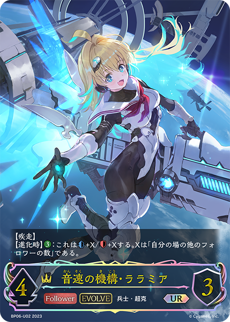音速の機構・ララミア クラス ロイヤル カード種類 フォロワー・エボルヴ タイプ 兵士・超克 レアリティ UR 収録商品 ブースターパック第6弾「絶対なる覇者」 コスト-攻撃力4体力3 【疾走】【進化時】:これは+X/+Xする。Xは「自分の場の他のフォロワーの数」である。 ぽんずBP06-U02