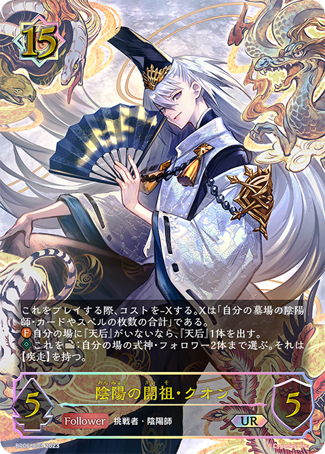 陰陽の開祖・クオン クラス ウィッチ カード種類 フォロワー タイプ 挑戦者・陰陽師 レアリティ UR 収録商品 ブースターパック第6弾「絶対なる覇者」 コスト15攻撃力5体力5 これをプレイする際、コストを-Xする。Xは「自分の墓場の陰陽師・カードやスペルの枚数の合計」である。自分の場に『天后』がいないなら、『天后』1体を出す。これを:自分の場の式神・フォロワー2体まで選ぶ。それは【疾走】を持つ。 虹原BP06-U03