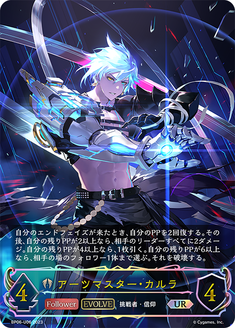 アーツマスター・カルラ クラス ビショップ カード種類 フォロワー・エボルヴ タイプ 挑戦者・信仰 レアリティ UR 収録商品 ブースターパック第6弾「絶対なる覇者」 コスト-攻撃力4体力4 自分のエンドフェイズが来たとき、自分のPPを2回復する。その後、自分の残りPPが2以上なら、相手のリーダーすべてに2ダメージ。自分の残りPPが4以上なら、1枚引く。自分の残りPPが6以上なら、相手の場のフォロワー1体まで選ぶ。それを破壊する。 永守浩太BP06-U06