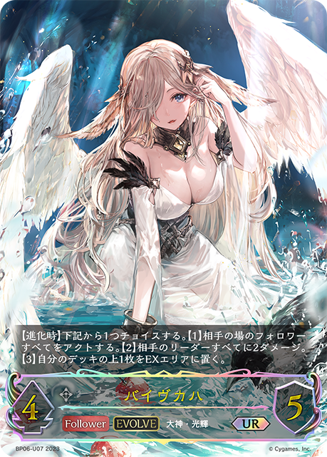 バイヴカハ クラス ニュートラル カード種類 フォロワー タイプ 大神・光輝 レアリティ SL 収録商品 ブースターパック第6弾「絶対なる覇者」 コスト3攻撃力2体力3 :これは進化する。下記から1つチョイスする。【1】自分の場の他のフォロワー1体を選ぶ。それは+1/+1する。【2】自分のリーダーは+2する。【3】自分のデッキの上3枚を見る。その中から、好きな枚数を好きな順にデッキの上に置く。残りを好きな順にデッキの下に置く。 虹原BP06-SL20