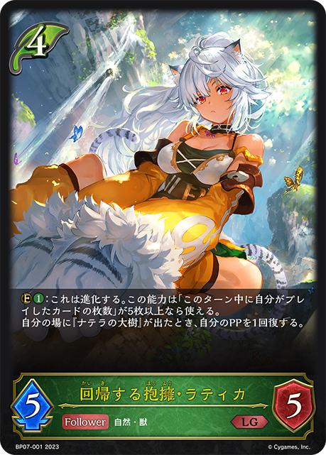 回帰する抱擁・ラティカ クラス エルフ カード種類 フォロワー タイプ 自然・獣 レアリティ LG 収録商品 ブースターパック第7弾「森羅鋼鉄」 コスト4攻撃力5体力5 :これは進化する。この能力は「このターン中に自分がプレイしたカードの枚数」が5枚以上なら使える。自分の場に『ナテラの大樹』が出たとき、自分のPPを1回復する。 ぽんずBP07-001