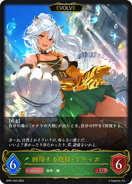 回帰する抱擁・ラティカ クラス エルフ カード種類 フォロワー・エボルヴ タイプ 自然・獣 レアリティ LG 収録商品 ブースターパック第7弾「森羅鋼鉄」 コスト-攻撃力6体力6 【疾走】自分の場に『ナテラの大樹』が出たとき、自分のPPを1回復する。 あーね、自然とかそういうの、知らない感じだ。いいよ?暑かったり冷たかったり。草。語彙ないかよ。 ぽんずBP07-002