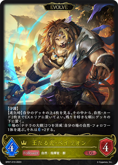 王たる光・ベイリオン クラス ロイヤル カード種類 フォロワー・エボルヴ タイプ 自然・指揮官・獣 レアリティ LG 収録商品 ブースターパック第7弾「森羅鋼鉄」 コスト-攻撃力4体力4 【守護】【進化時】自分のデッキの上4枚を見る。その中から、自然・カード2枚までEXエリアに置いてよい。残りを好きな順にデッキの下に置く。場の『ナテラの大樹』2つを消滅:自分の場の自然・フォロワー1体を選ぶ。それは+2する。 風篠BP07-019
