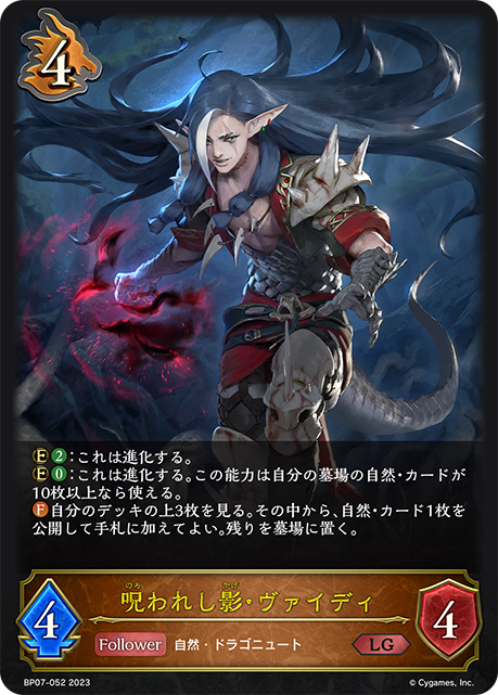 呪われし影・ヴァイディ クラス ドラゴン カード種類 フォロワー タイプ 自然・ドラゴニュート レアリティ LG 収録商品 ブースターパック第7弾「森羅鋼鉄」 コスト4攻撃力4体力4 :これは進化する。:これは進化する。この能力は自分の墓場の自然・カードが10枚以上なら使える。自分のデッキの上3枚を見る。その中から、自然・カード1枚を公開して手札に加えてよい。残りを墓場に置く。 南保あたるBP07-052