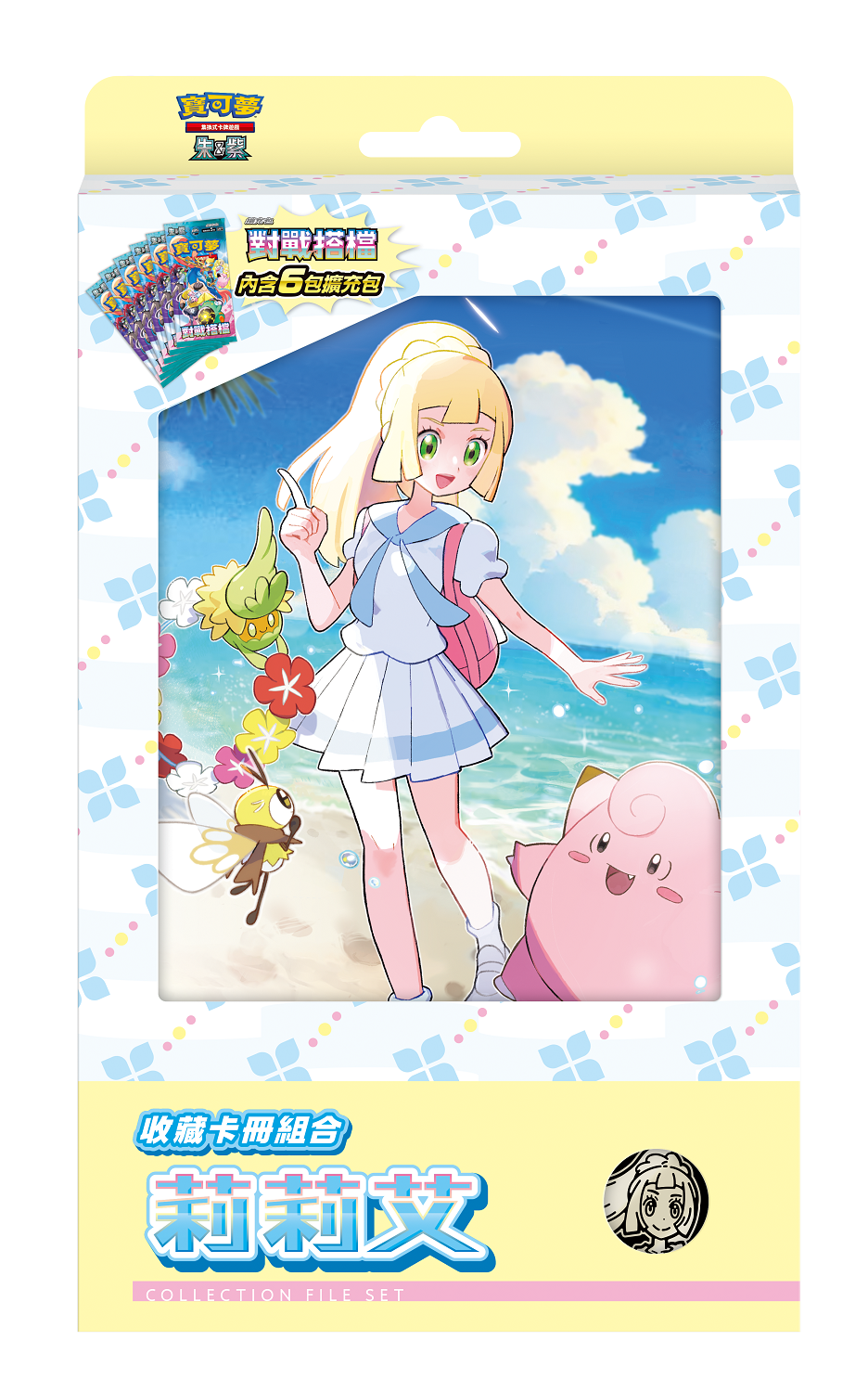 概覽 內容物:特典卡「莉莉艾的花療環環」(閃卡)⋯1張卡冊「莉莉艾」(4格內頁10頁/卡牌收納張數80張)⋯1本擴充包「對戰搭檔」⋯6包※卡牌為隨機收錄5張卡。寶可夢硬幣⋯1枚